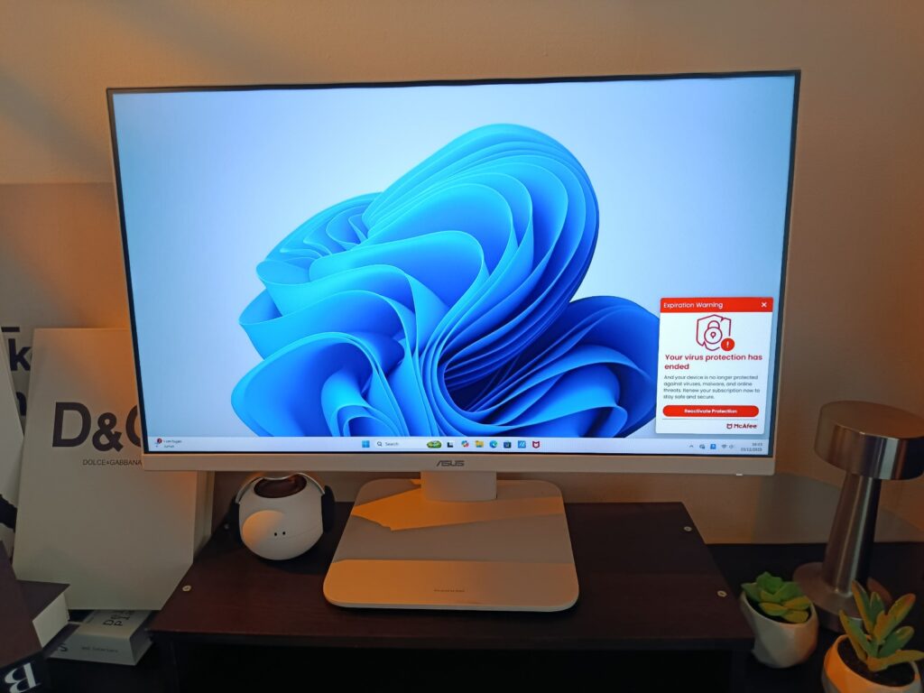 ASUS AiO V400 dibekali kamera berbasis AI dengan fitur pengaburan latar belakang dan koreksi pencahayaan otomatis. Jadi, meskipun saya hanya duduk di sudut ruangan dengan cahaya seadanya, tampilan saya di layar tetap terlihat profesional dan cerah.